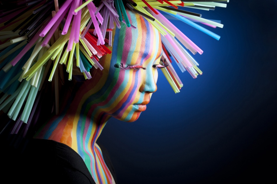We decided our next image needed to be colorful: something that really popped! We bought some straws from the convenience store close to the hair salon where we were shooting. It actually took us about 3 hours to finish the straw hair and makeup. While one of my friends was creating our model's straw hair, the other was painting her face. While we were shooting, they still had to work on her hair and face paint — the straws moved around a lot, exposing her real hair to the camera every so often.