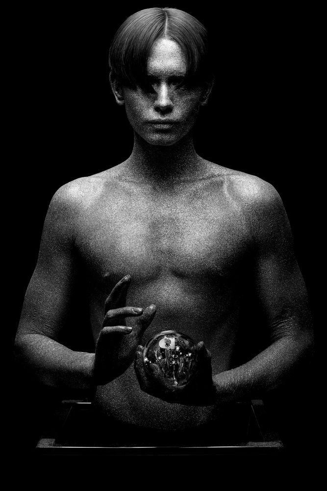 The next day Gautier continued with his project “New Humans”, a lot of these androgyny photographs, show selfish, stylish and bizarre humans and were published on 1x already. It’s about our society today, where the successful change character and interests. They lose empathy for their surrounding, become cold, beautiful - but empty, busy only with themselves and keeping on the track of success. The works for Gautier’s projects often have some stylish aspect, because that’s all “New Humans” strive for, coolness and beauty.