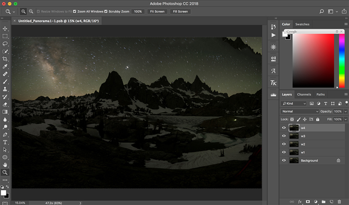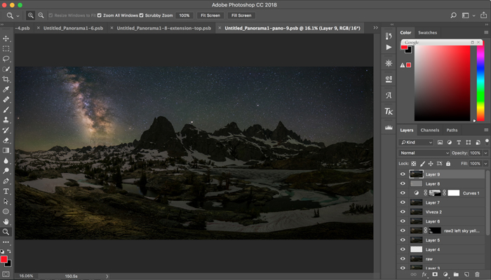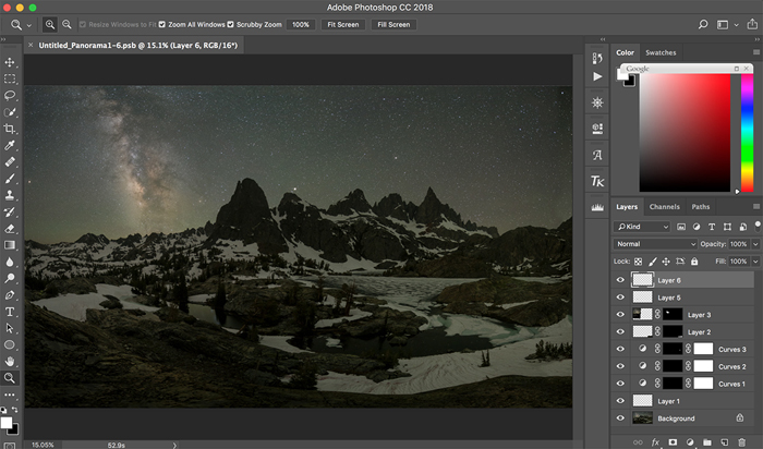 Taking Minaret Lake as an example, by using “Photomerge” function in Photoshop CC 2018, I did two photo merges, one for the series of 9 foreground photos, and the other 9 photos for the sky. The results are shown below: