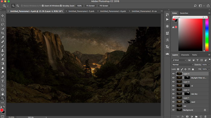 To achieve this goal, for each of these two photography actions, I took two series of shots, which formed two panorama images after stitching together – one focused on the foreground and one focused on the sky, with the same focal points but different exposure times.