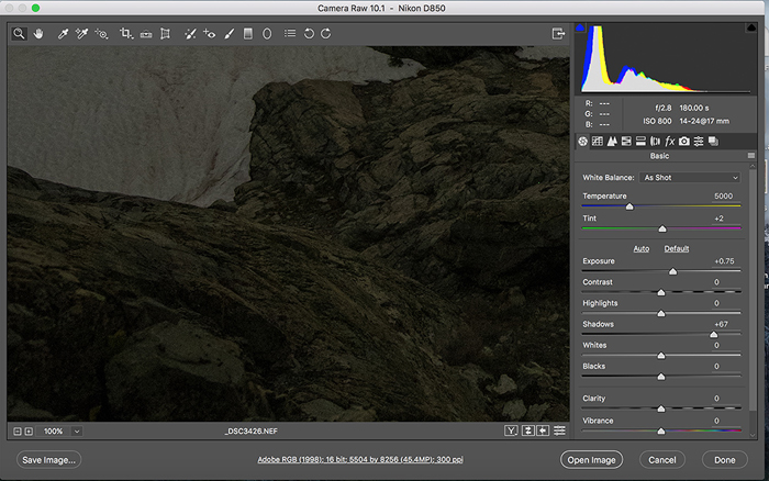 (a) Long exposure for Minaret Lake: 180 seconds with camera long exposure noise reduction on.