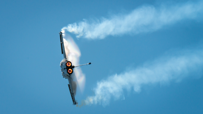 3. Visualisation  of the image has the jet flying past in a turn with the camera pointing into the engine as it moves away. The wings are at an angle of around 30 degrees to the vertical and the top surface of the wings can be seen so that the condensation stands out and the cockpit is visible. In this attitude, it is a compromise between the view of the engine and a sufficient view of the wing surfaces. Opportunities to practice the shot only occur at a couple of airshows during the year so it’s a slow iteration to reach the ideal.