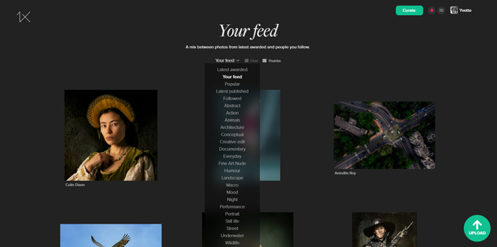 'Your feed' is the red line to follow to see the published and awarded work of your favourite photographers on 1x.