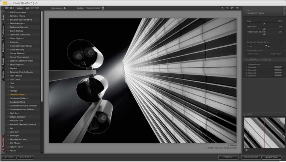 5) This next step is very important: applying a softening effect to the overall image. I opened the image in Color Efex Pro 3 and applied the Glamour Glow filter, Glow set to 30%, mainly to eliminate imperfections and contour lines.
